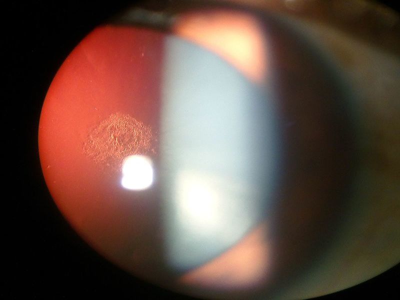 Cortical cataracts are due to the lens cortex (outer layer) becoming opaque. They occur when changes in the fluid contained in the periphery of the lens causes fissuring. When these cataracts are viewed through an ophthalmoscope, or other magnification system, the appearance is similar to white spokes of a wheel. Symptoms often include problems with glare and light scatter at night.